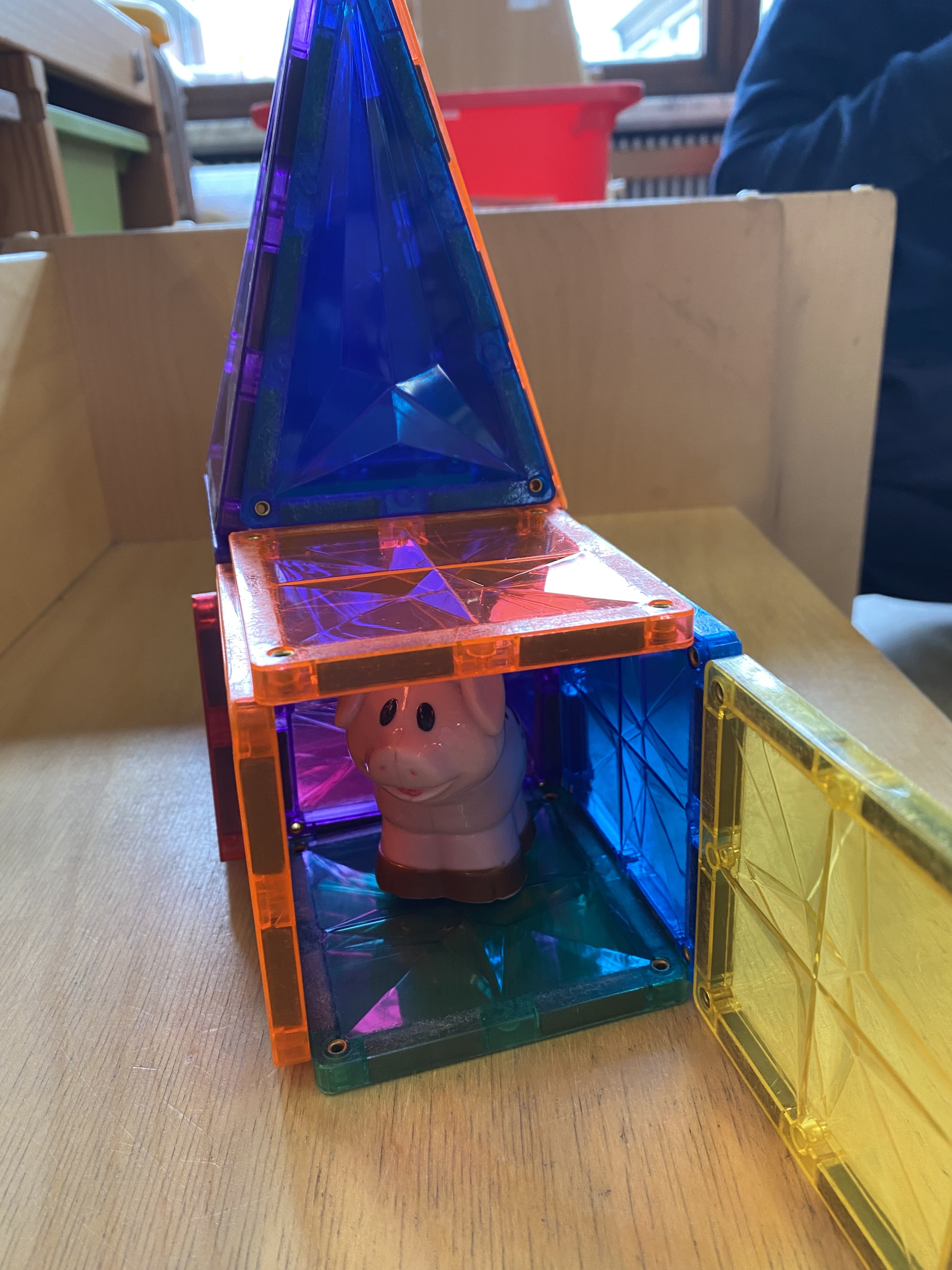 3 huisjes maken voor de biggen. 1 van stoor, 1 van hout en 1 van steen.